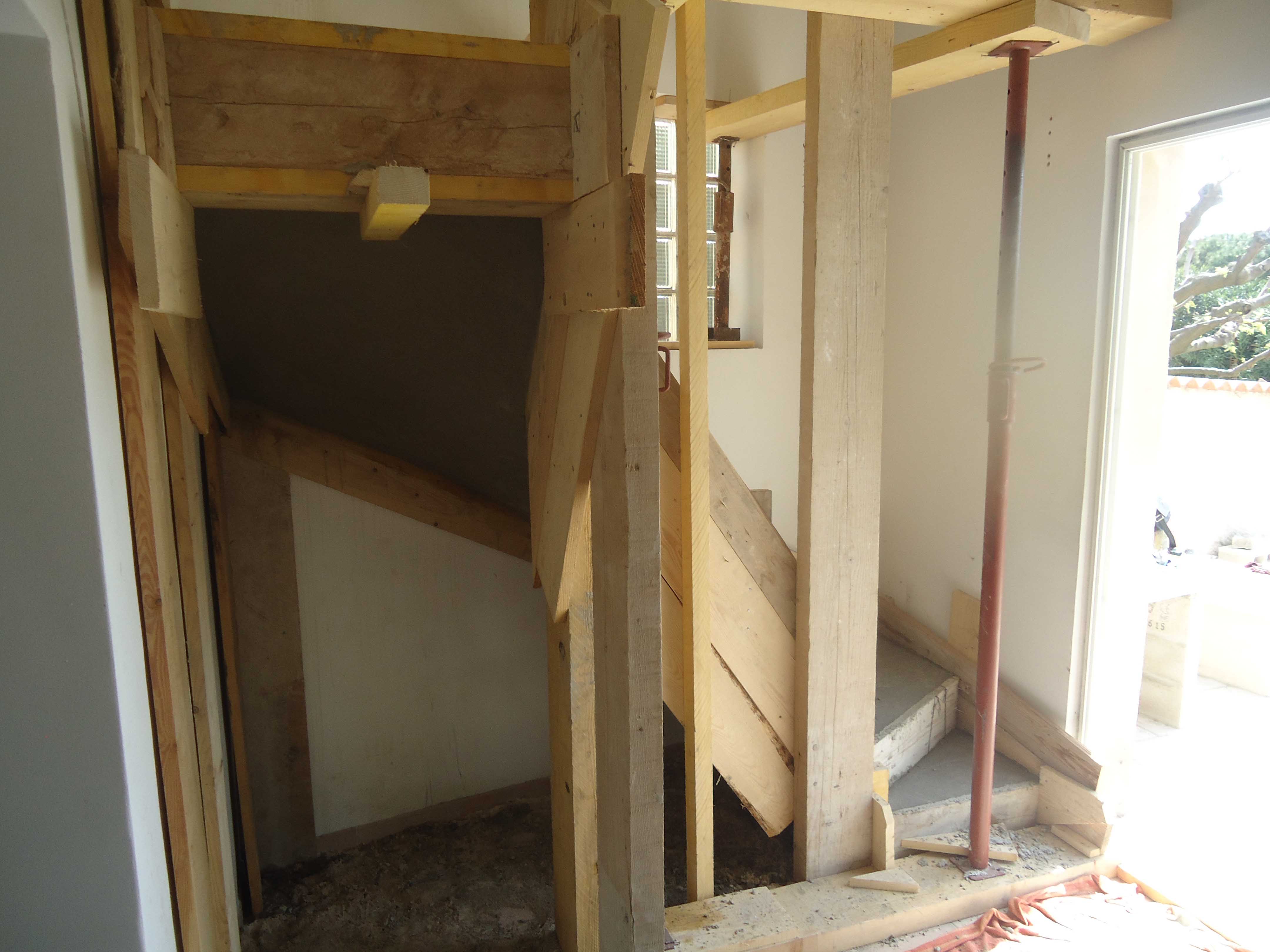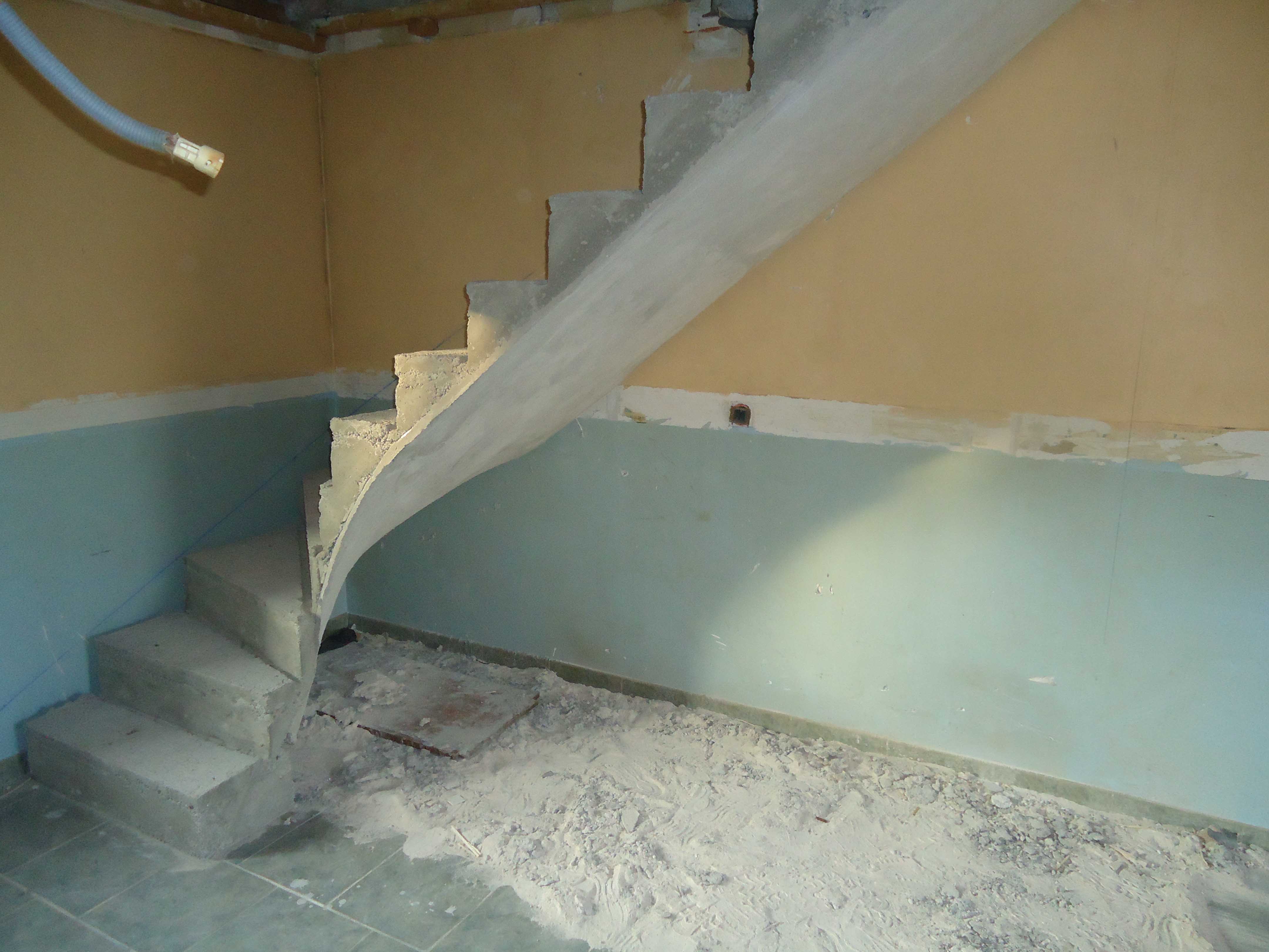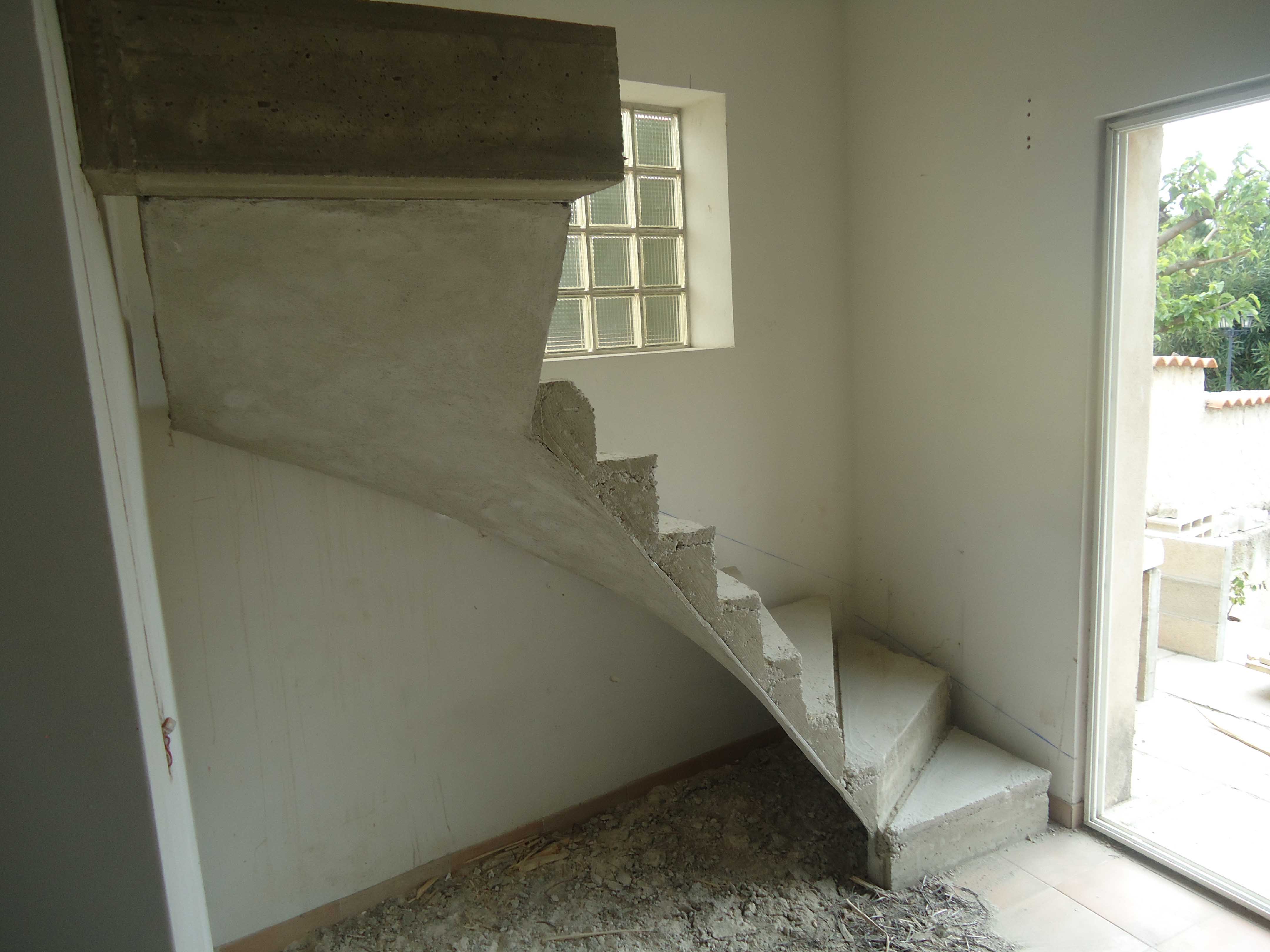 Après le coulage de l'escalier. Le lendemain un légé enduit de rattrapage frottassé fin à base de résine est effectué sous la paillasse de l'ouvrage pour l'accrochage de réagréage, enduit de couleur, béton ciré, ou plâtre.